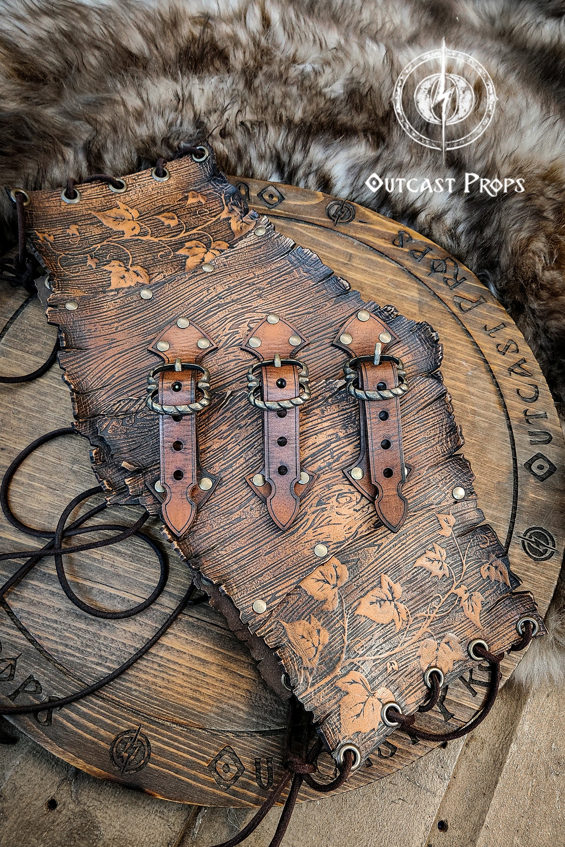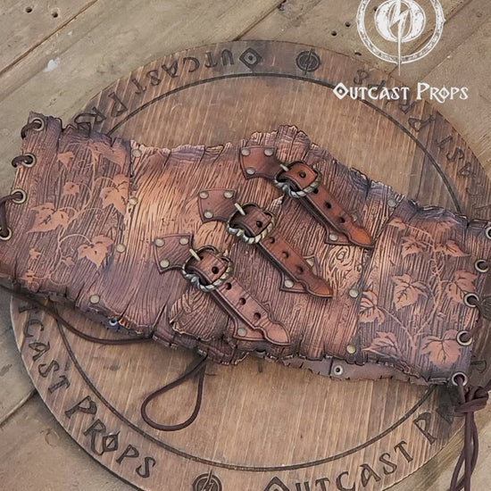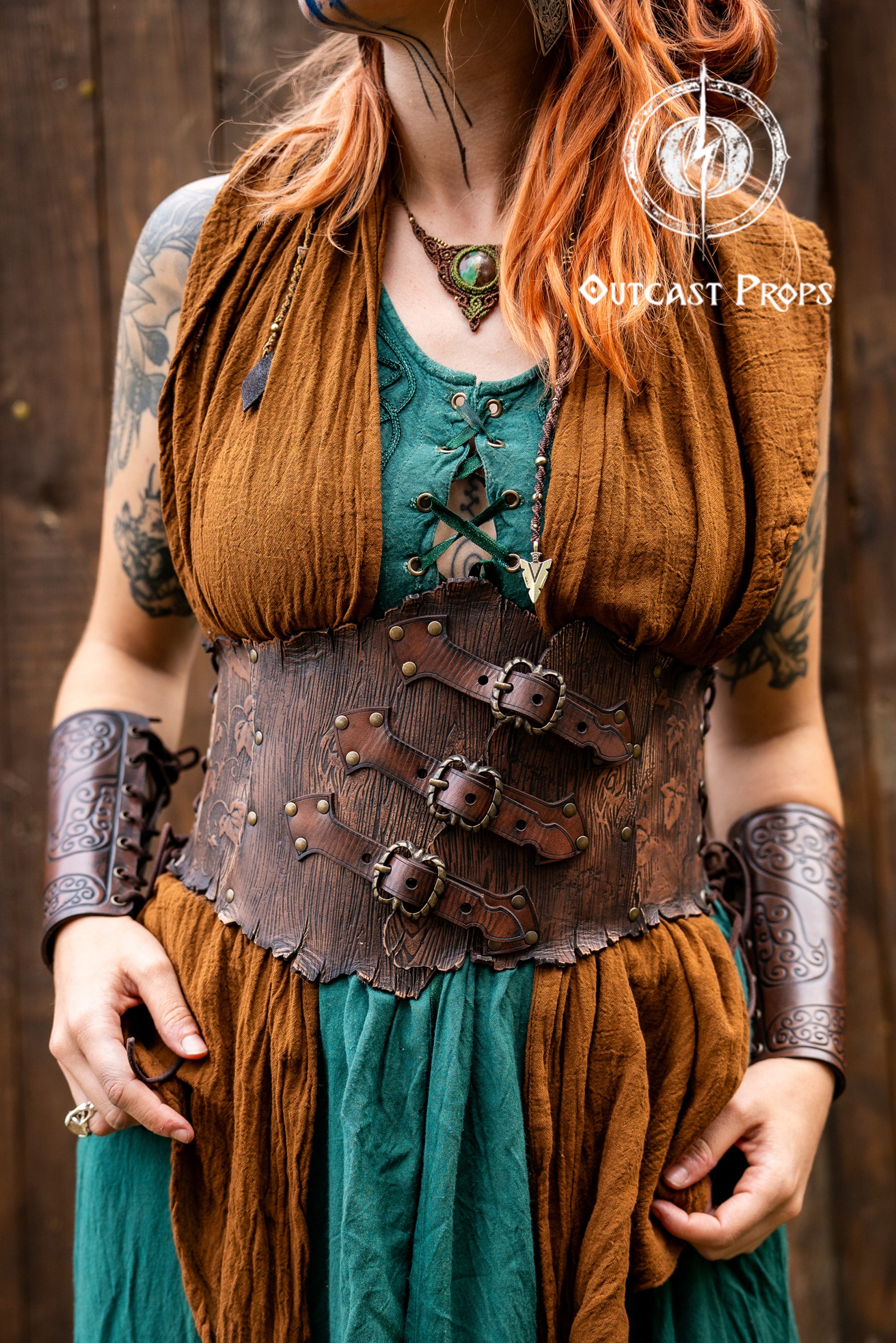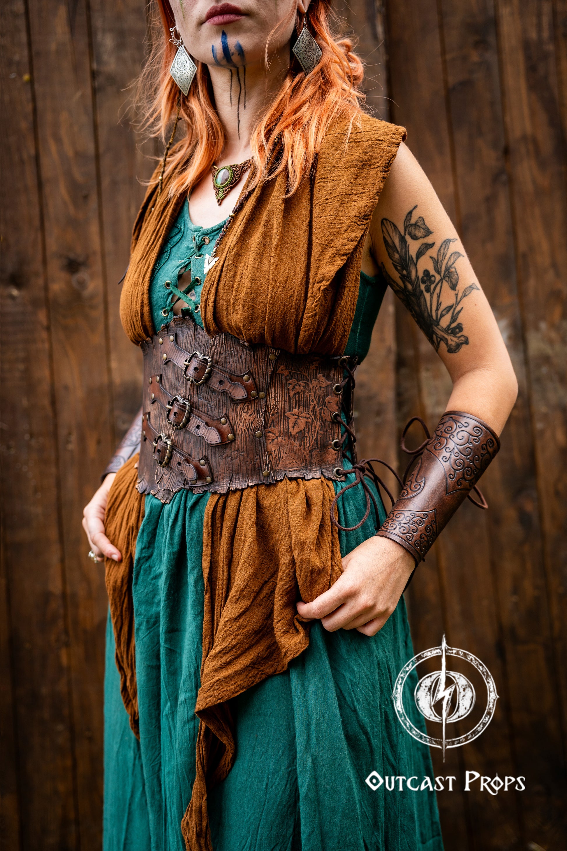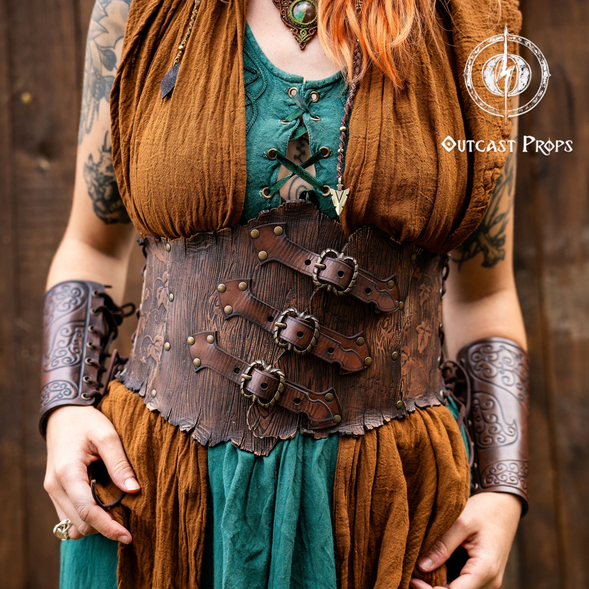 Crafted from full grain, premium vegetable-tanned leather, this corset belt balances durability and comfort with refined artisan detail. Hand-dyed with natural pigments, embossed with floral and bark-like textures, and finished using Outcast Props’ unique aging techniques and epic painting, each piece carries a forest-inspired character of its own. Adjustable side and back lacing secure the fit, while three front straps provide dramatic detail.