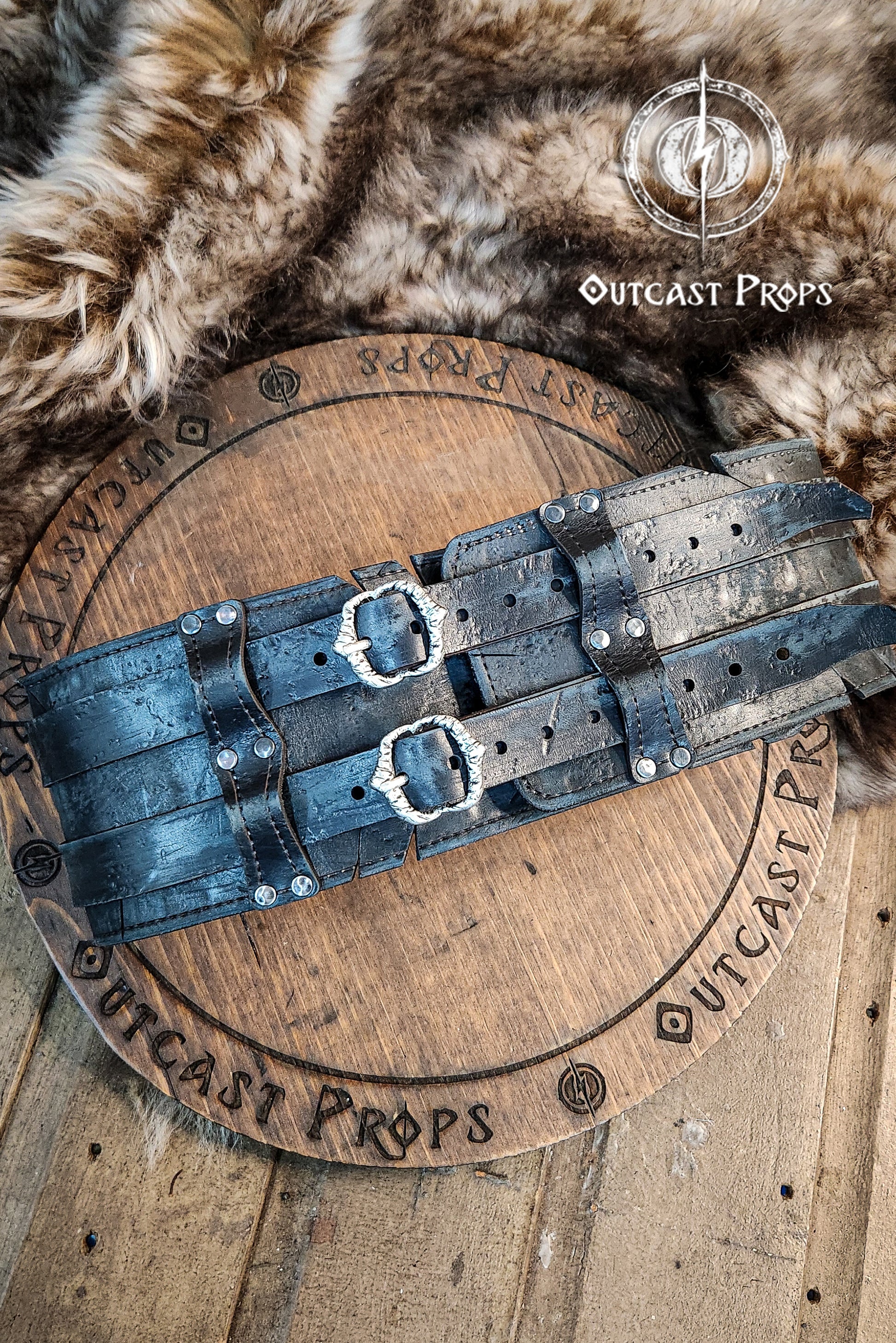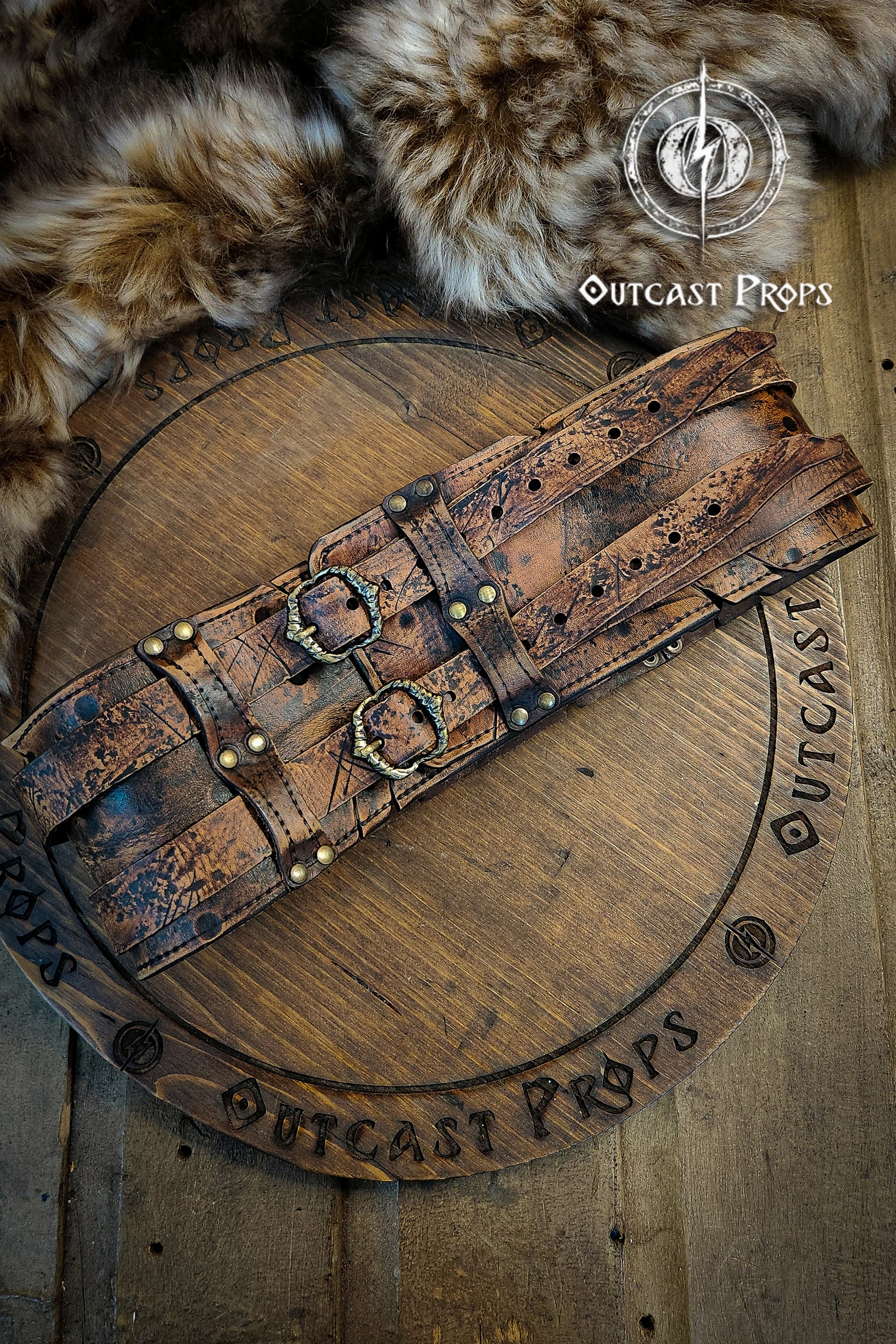 Worn by raiders and mercenaries alike, this handcrafted leather belt carries the marks of countless battles. Made from premium vegetable-tanned leather, it features layered straps, double buckles and solid brass rivets. The surface is heavily aged with burn marks, scratches and distressed textures that give it the look of true battlefield gear. Built to complete warrior outfits for LARP, cosplay or fantasy costume.