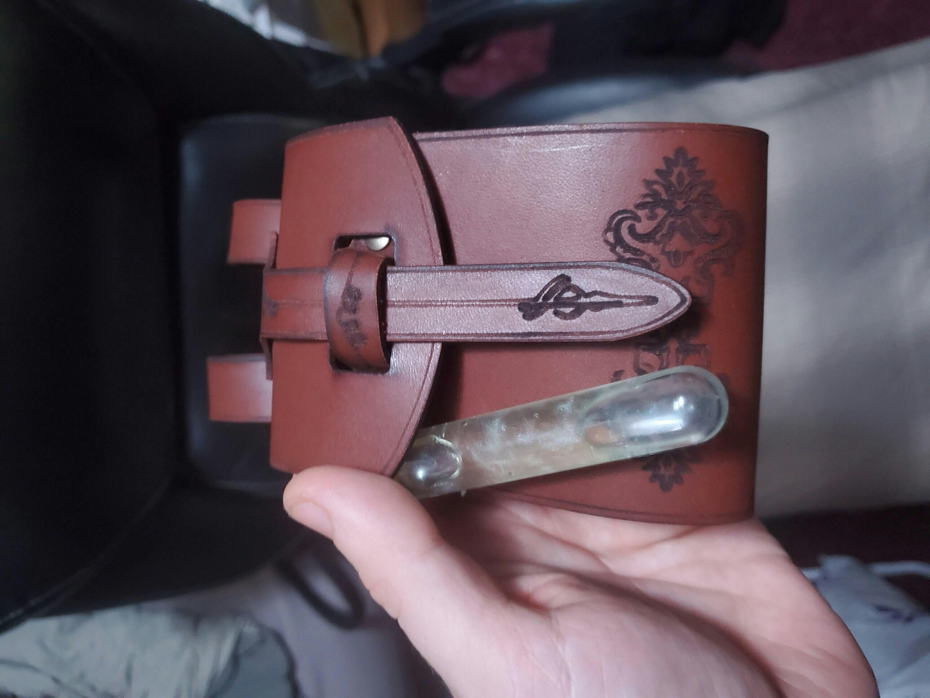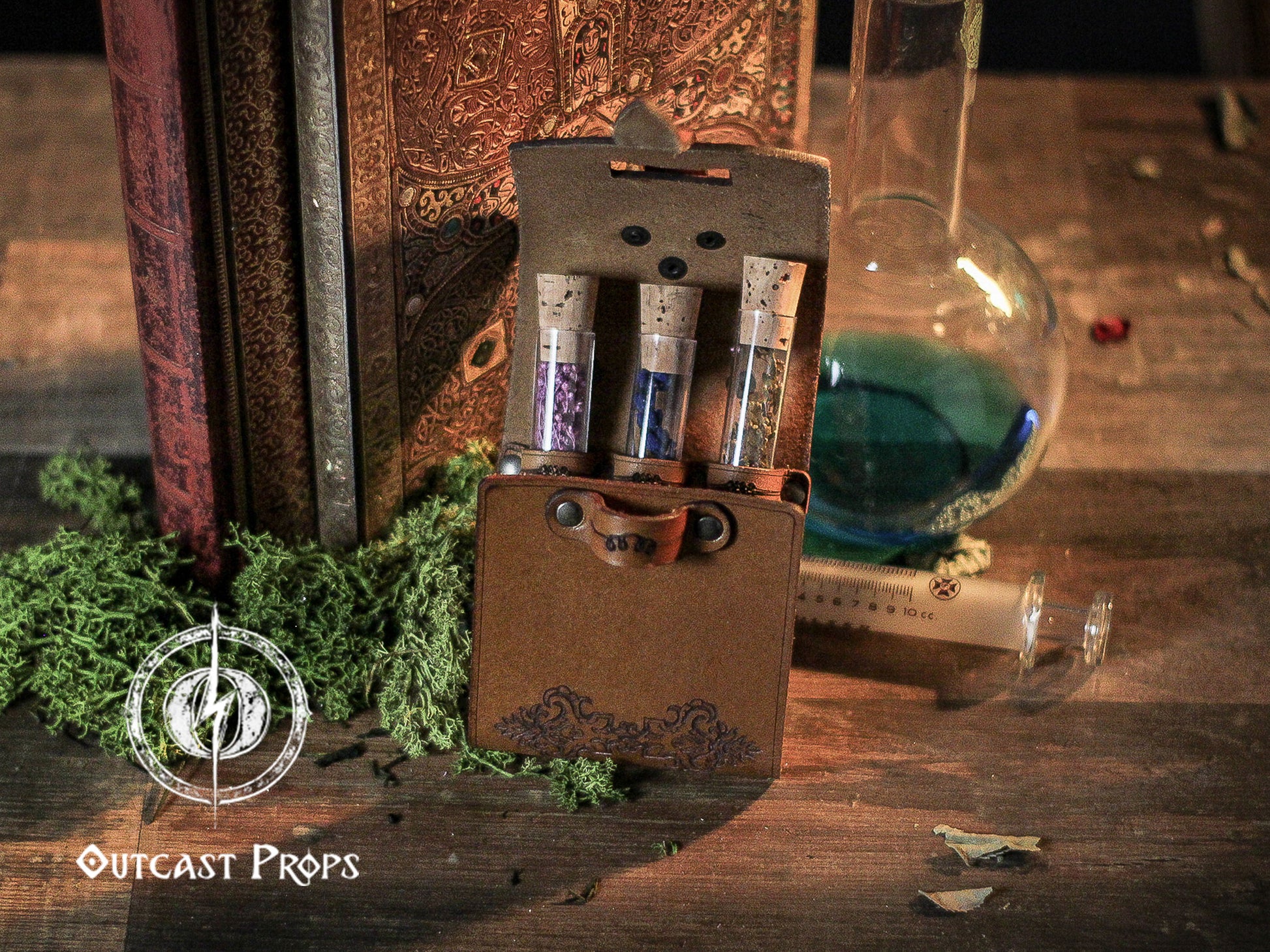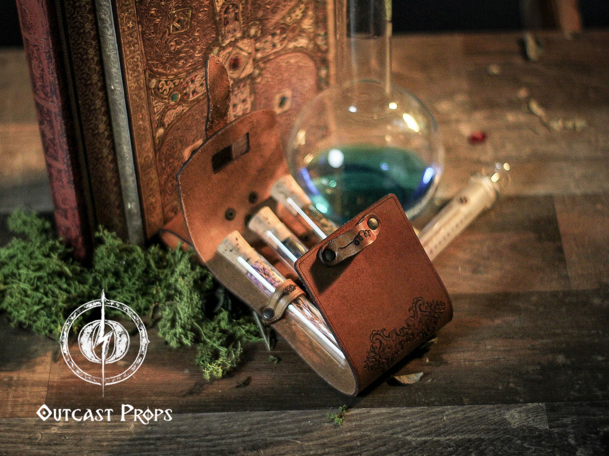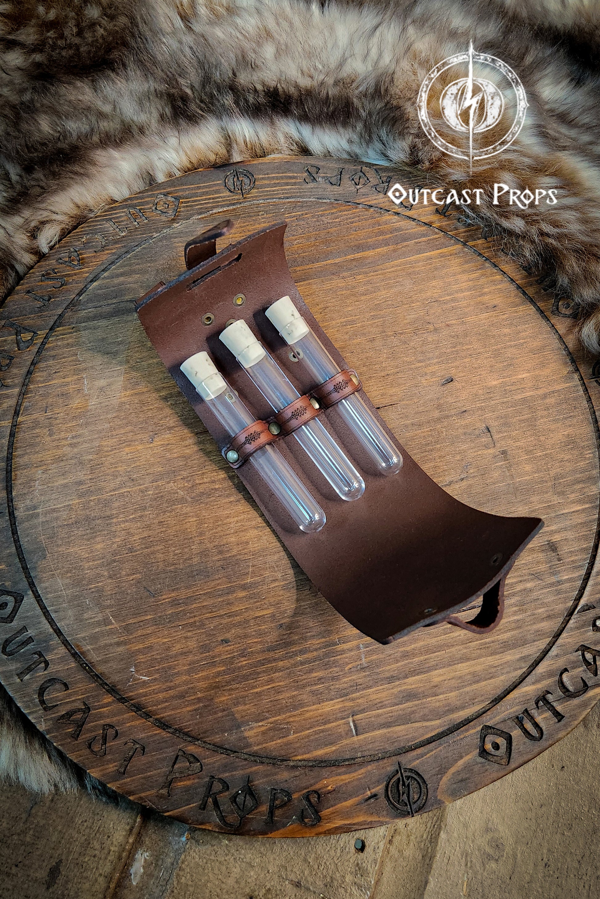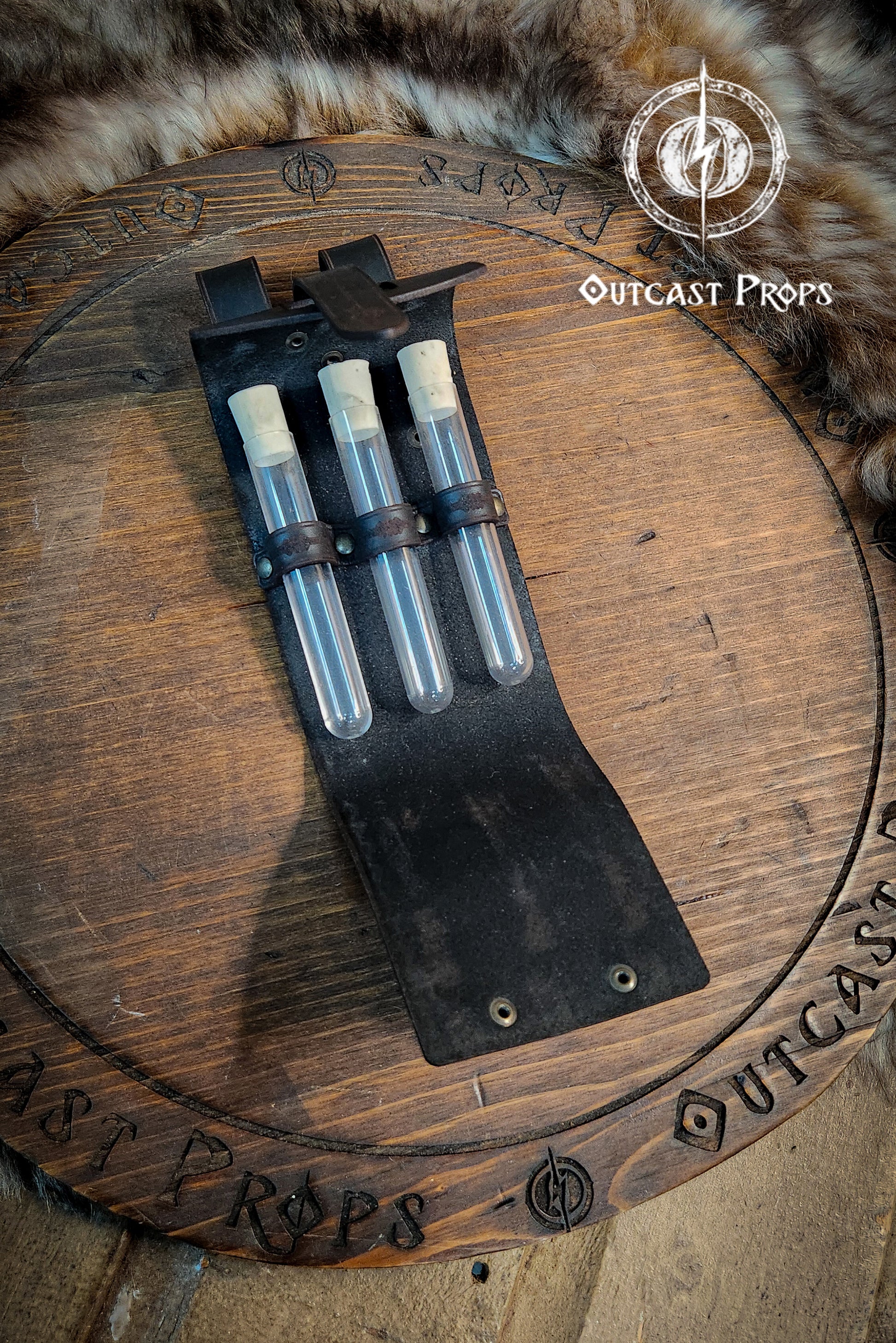 Our vial holster is a practical accessory to LARP costumes or cosplays that will allow you to carry three long vials in a elegant, well protected way. The vials are perfectly covered with tough leather, secured in place thanks to our tight pattern so they do not fall down when you run, but the vials will come out swiftly at your fingers' command. They vials themselves are made out of plastic, so extra safety for larpers, as they will be much more sturdy and resistant than glass!