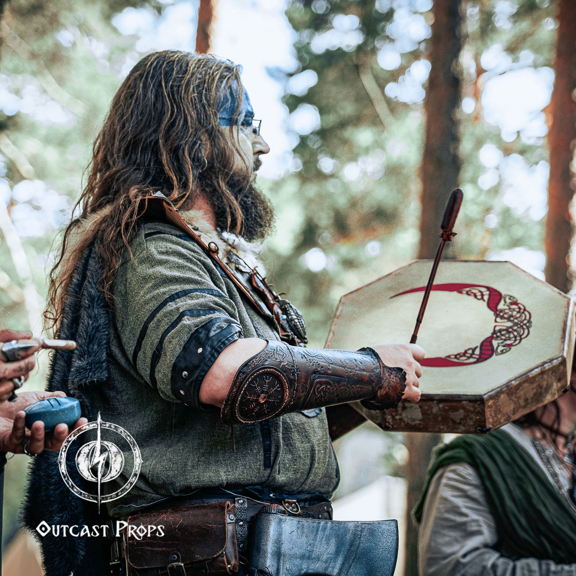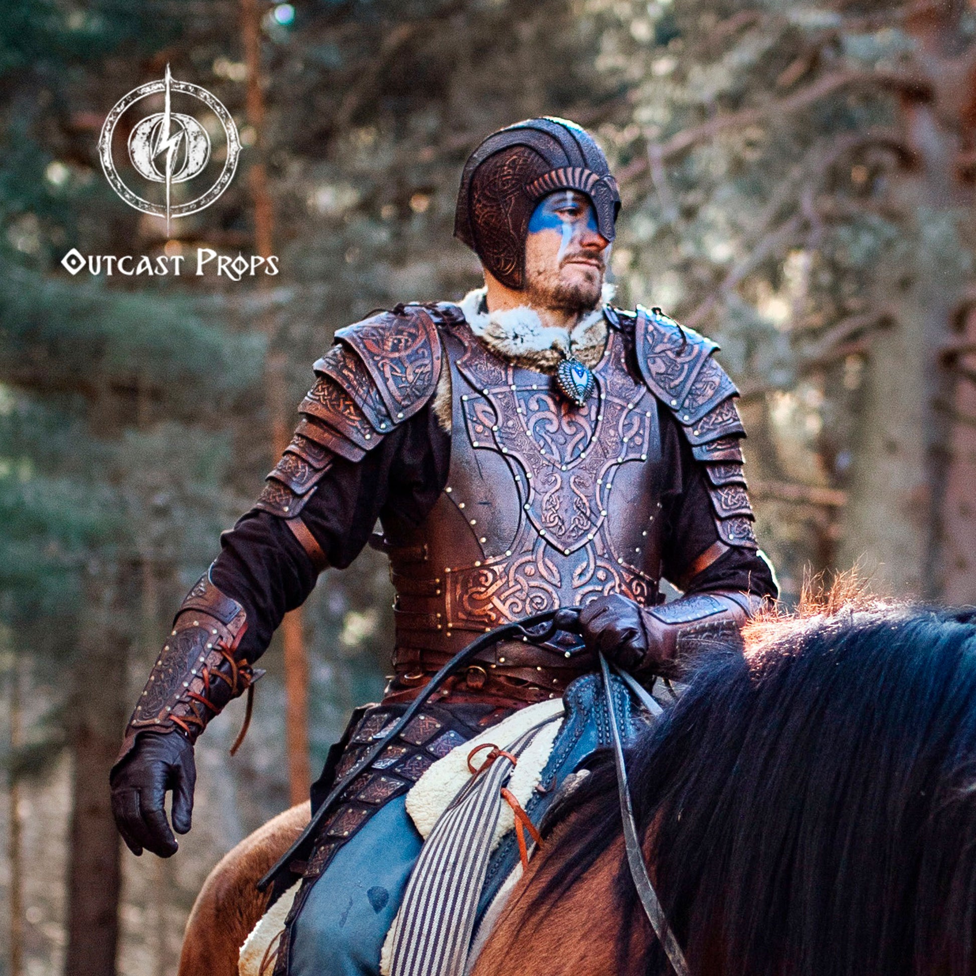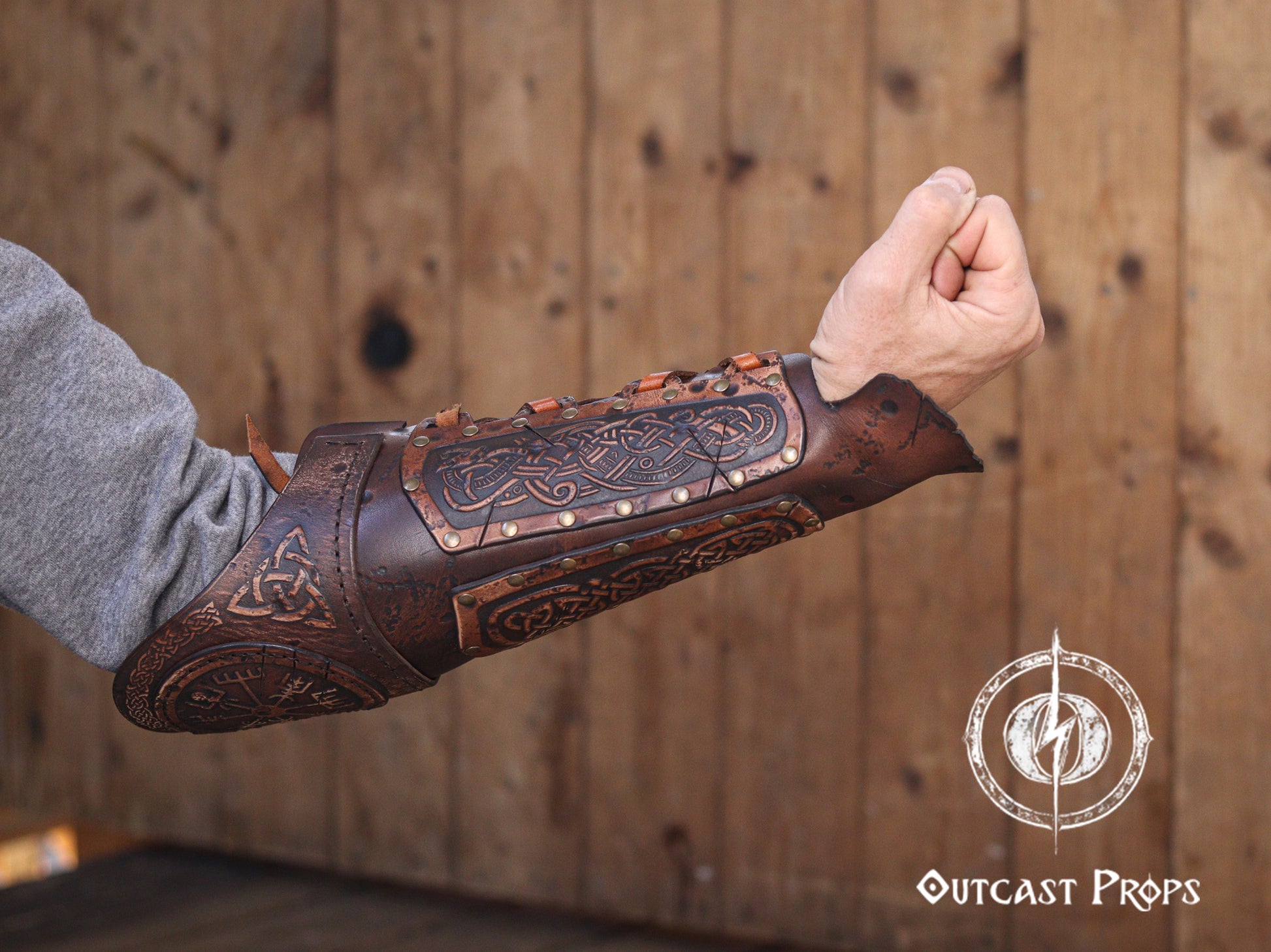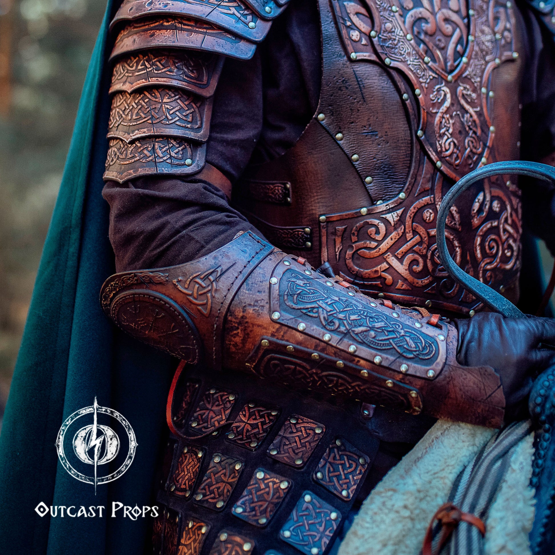 Made from full grain, premium vegetable-tanned leather, this piece combines durability with artistic engraving and unique aging techniques. Outcast Props applies natural dyes and hand-painted finishes through a process known for its cinematic realism, giving each bracer a distinctive, time-worn character. Adjustable goat-leather straps and brass rivets provide comfort and strength for long adventures.