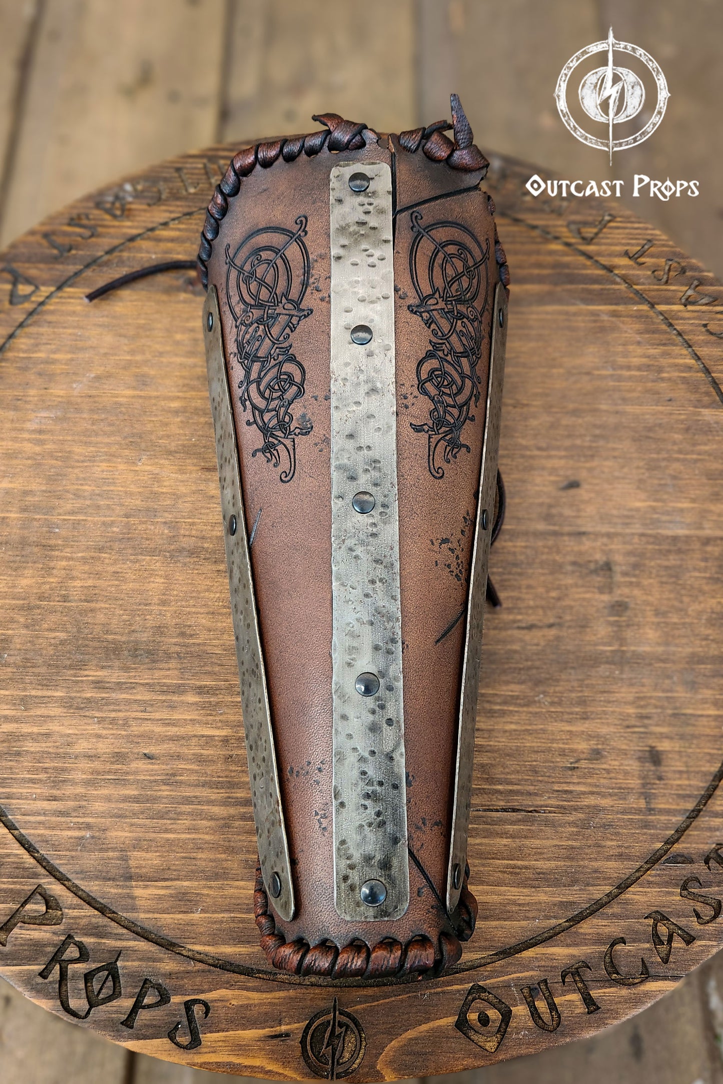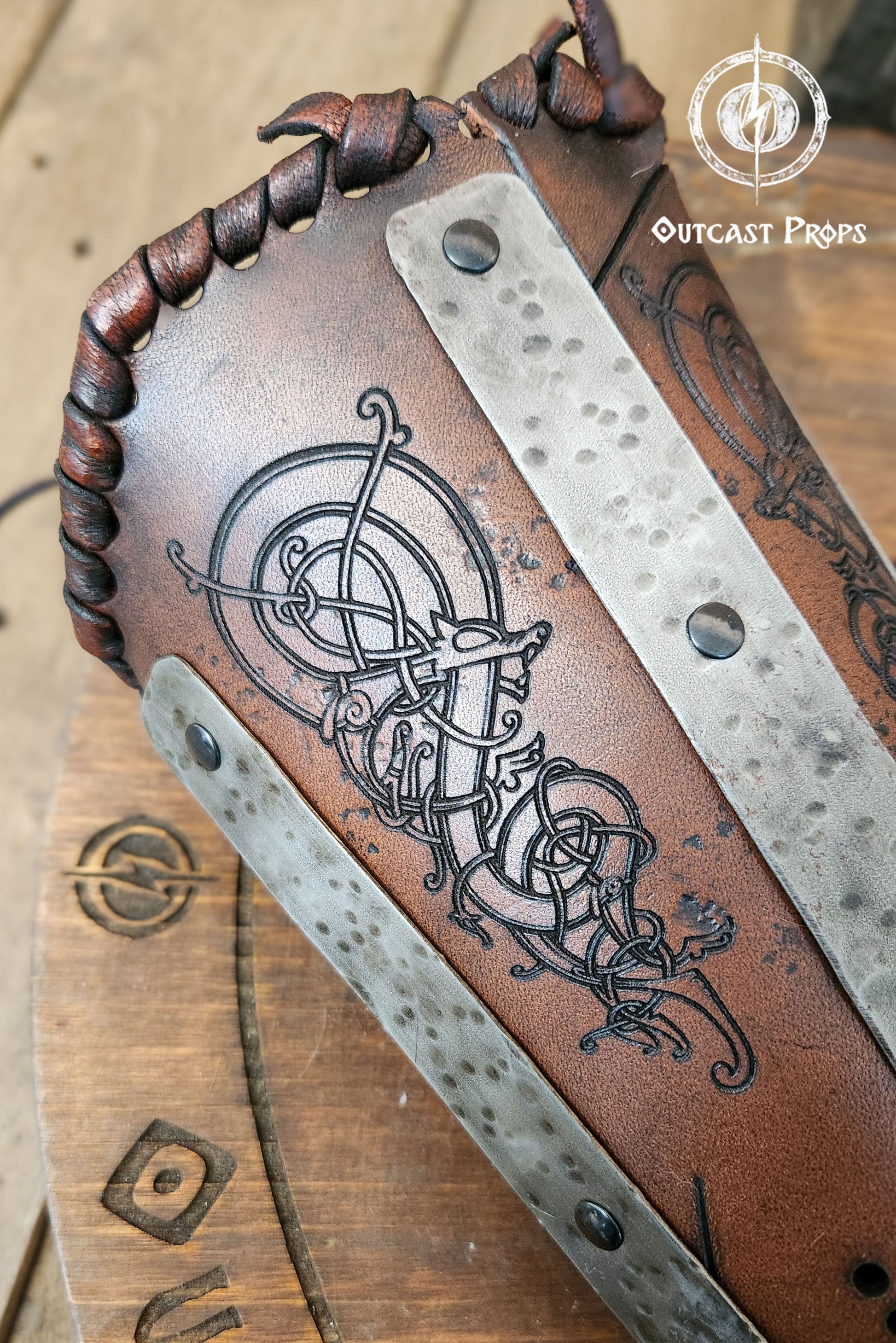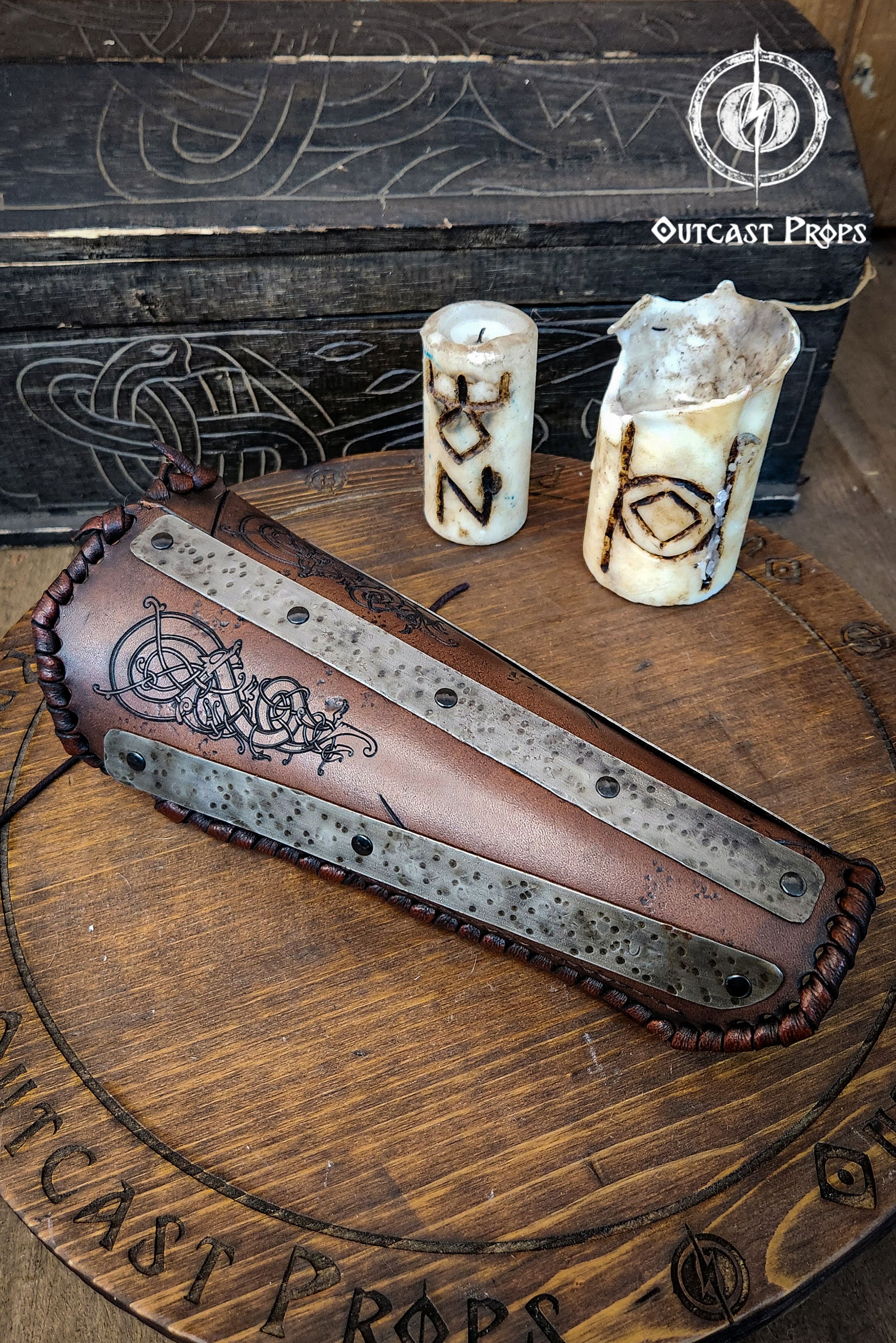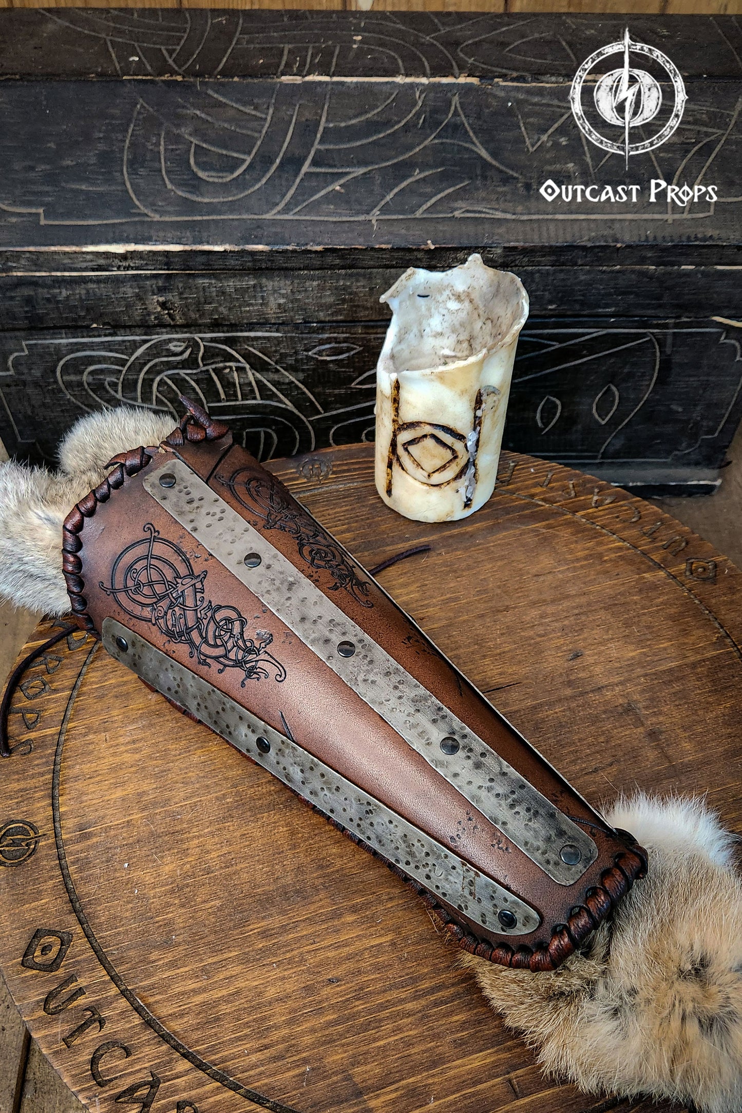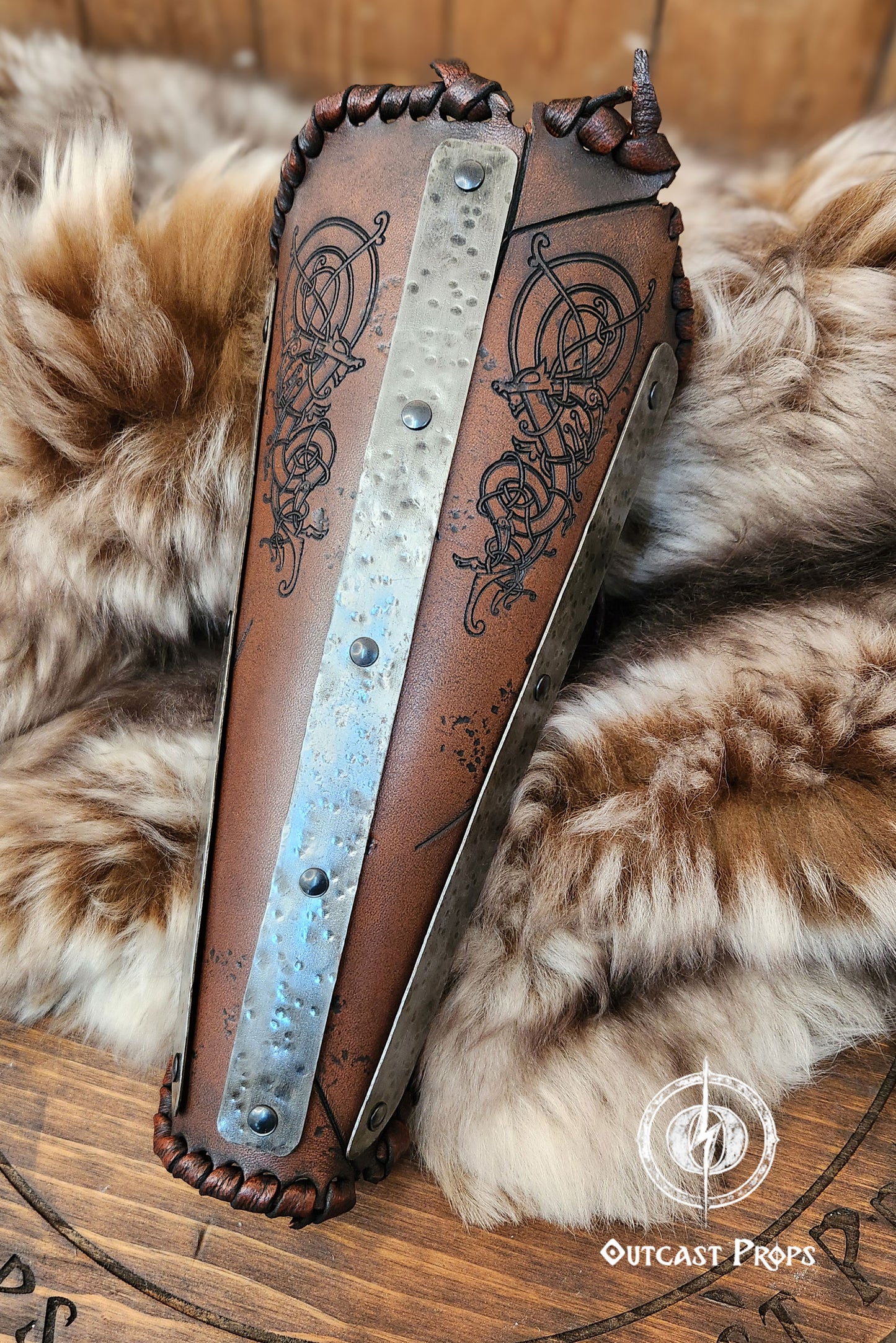 This is a very realistic armlet, sewn by hand and with strips of hand-hammered and lightly blued metal to give it authenticity and realism. With a viking dragon engraved.